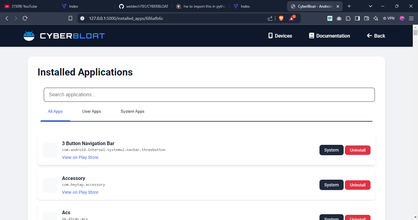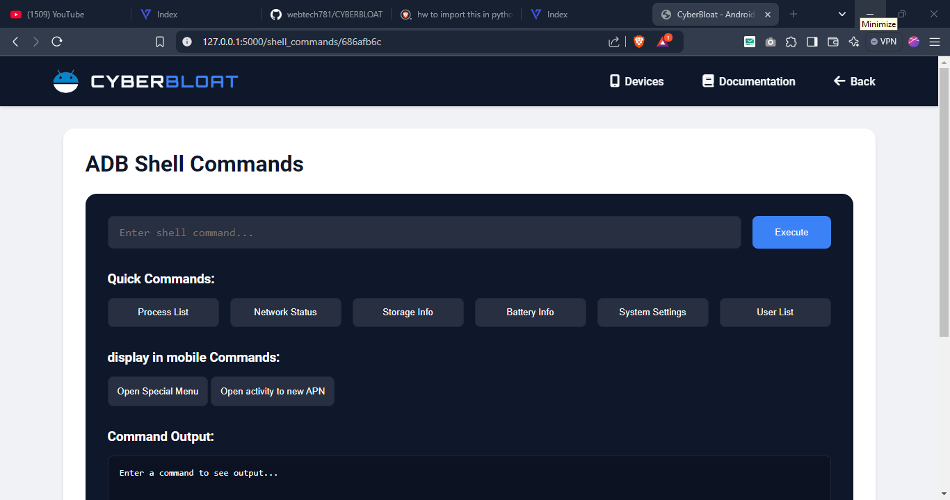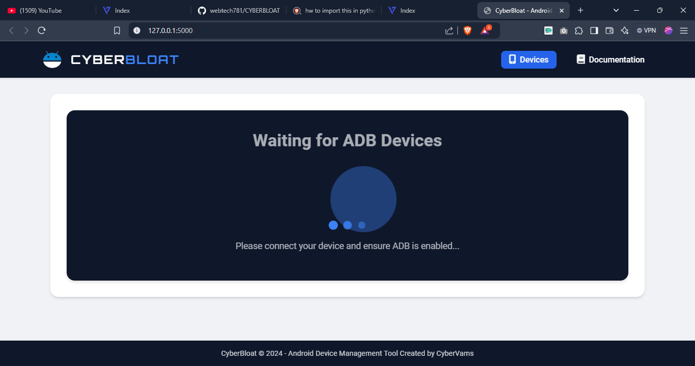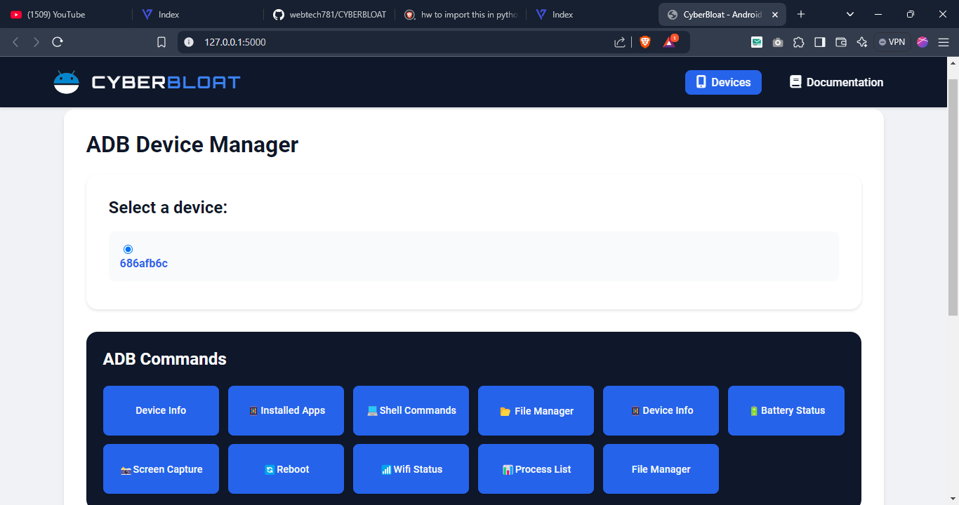 CyberBloat is a web-based Android device management tool that provides a user-friendly interface for ADB (Android Debug Bridge) operations. It allows you to manage your Android device through a local web interface.